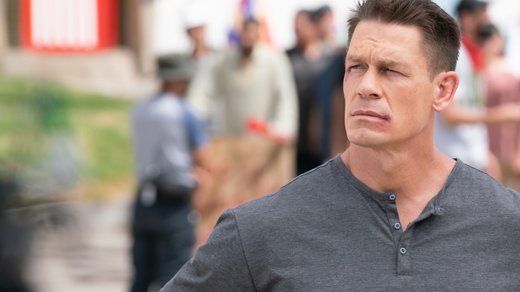 Special forces operative John Cena provides security for journalist Alison Brie after a military coup ruins her interview. Language/violence/mature themes/flashing images. (2023)(108 mins)