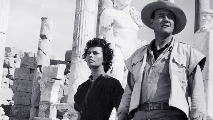 John Wayne is the American hired to take a man on an expedition into the desert in search of treasure. Adventure with Sophia Loren. (1957)(109 mins)
