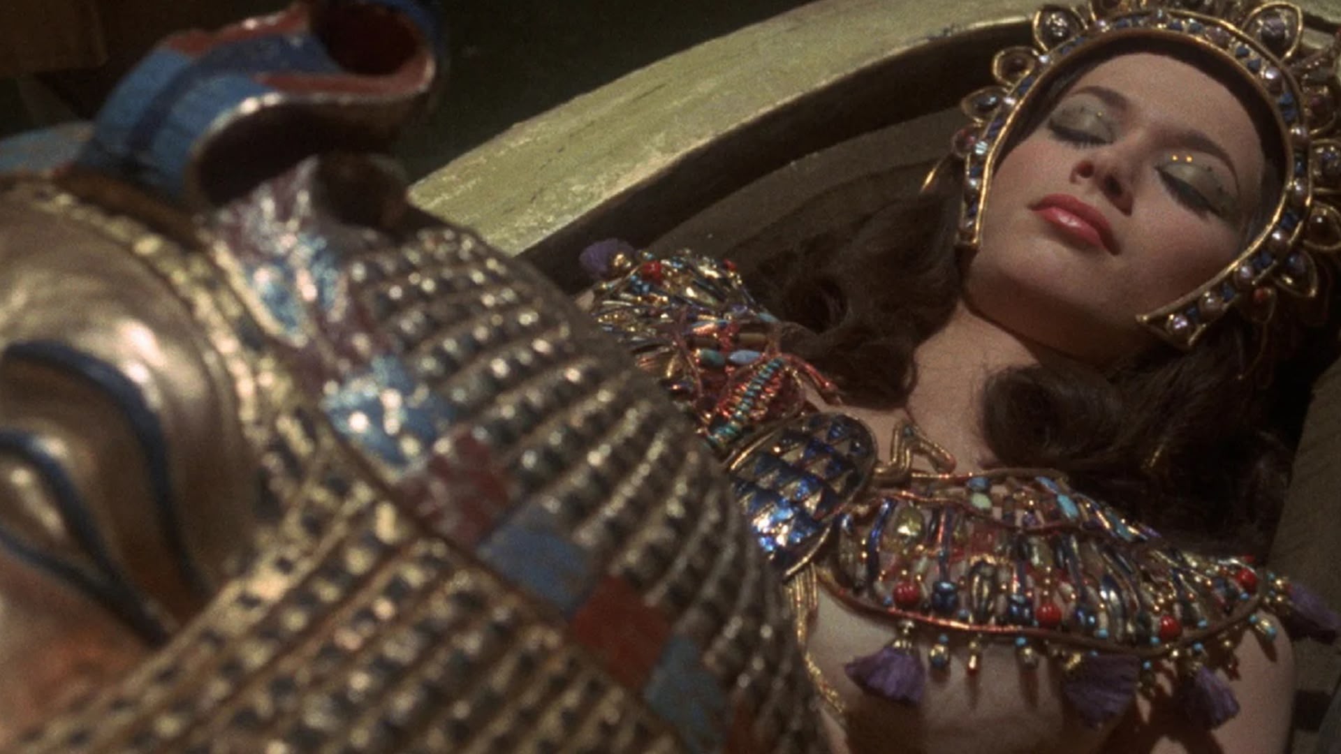 An archaeological expedition brings back to London the coffin of an Egyptian queen. Her spirit returns and strange things start to happen. Flashing images. (1971)(94 mins)