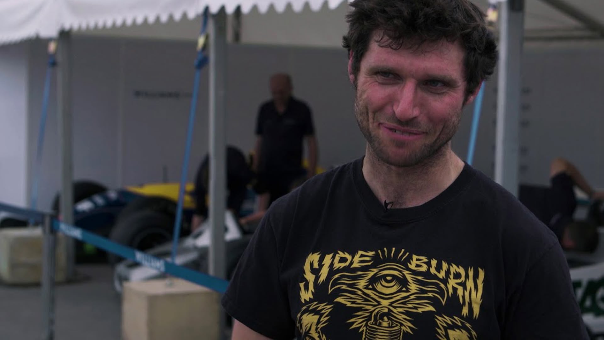 The motoring enthusiast helps rebuild the first 1983 Williams Formula 1 car that Ayrton Senna tested and races against Jenson Button in the six-wheeler FW08B.