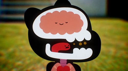 No, this animated series is not about anthropomorphic chewing gum, it's about a young cat named Gumball Watterson. Gumball has a penchant for getting into trouble, often resulting from his schemes, but he never seems to learn his lesson. Gumball's best friend is a fish named Darwin, who used to be the family pet until he grew legs and became part of the family. Gumball resents his younger sister, Anais, because she is the smartest member of the family. Gumball's mother is the breadwinner in the family, working long hours at the rainbow factory, and his father stays at home watching TV and playing video games.