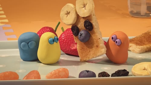 Yellow doesn't want to try the piece of fruit on their plate. What can Green, Blue, Orange and Pink do to encourage Yellow to explore new foods? (S3, ep 19)