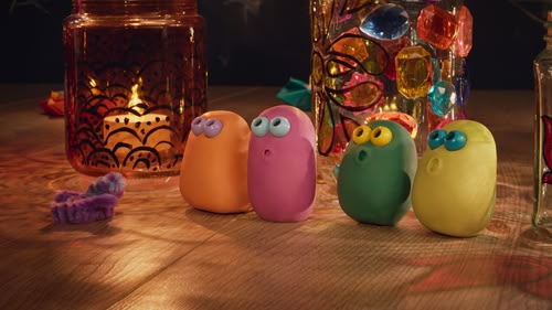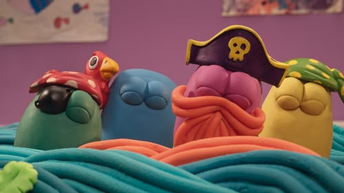 Orange dislikes the feel of spaghetti plasticine. But with Pirate Pink's clever idea, they join in the game without touching it and earn some treasure! (S3, ep 9)