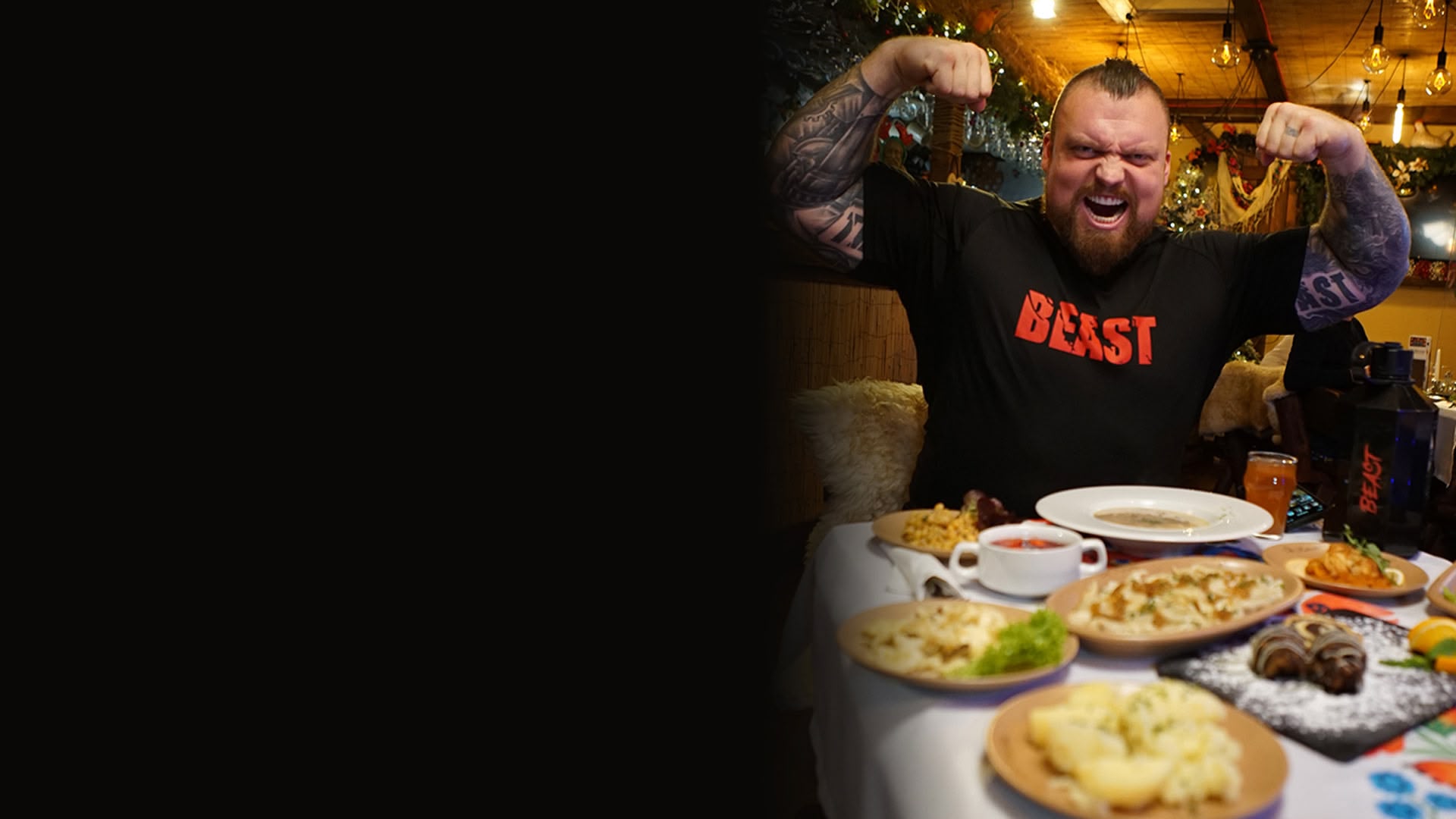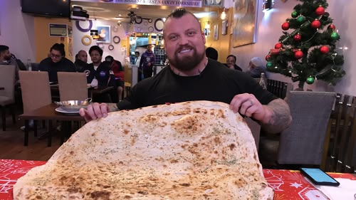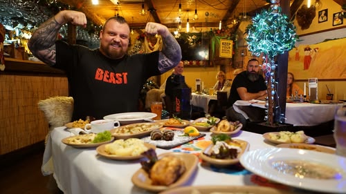 Eddie Hall, the 6ft 3in, 26st colossus, takes on eating challenges featuring traditional Christmas foods from a variety of communities based around the U.
