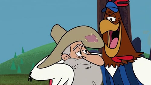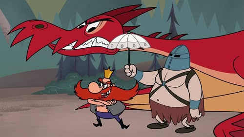 Worried that he's getting too old to be chasing dragons, Sir Littlechin mistakes Daffy for the mythical Phoenix./ Daffy crashes King Thes' fancy luau.