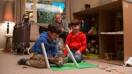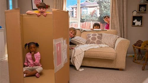 Mr Rosen visits Topsy and Tim and shows them how to make a house from a cardboard box.