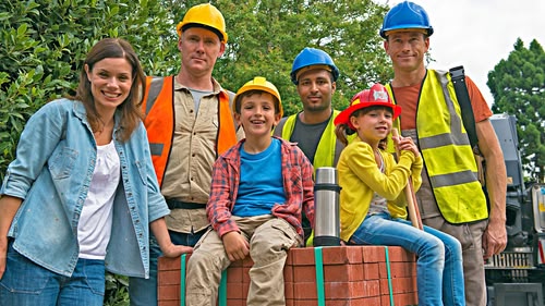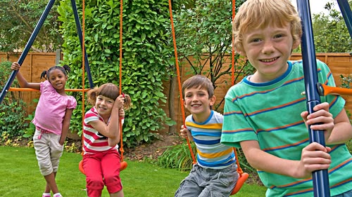 Kerry and Tony help put up new twin swings in Topsy and Tim's back garden.