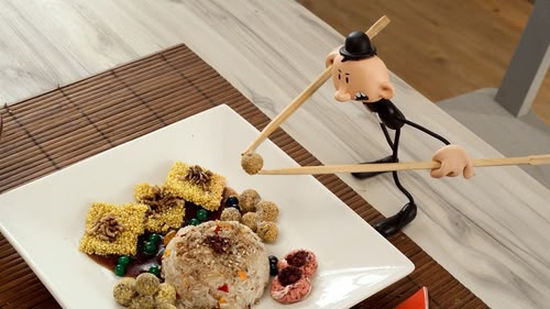 The tiniest man in the world is eating Chinese food with chopsticks. (S1, ep 50)