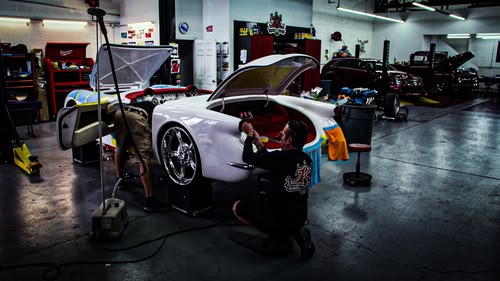 The whole team agrees that the body mods are just right, but now they must make it a reality. They need to bulge out the fenders and create a spider-shaped exhaust.(S08,E13)