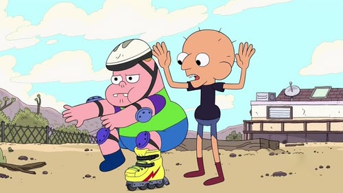 As Sumo and Clarence are playing outside Chelsea and Rita skate by on their new skateboards.