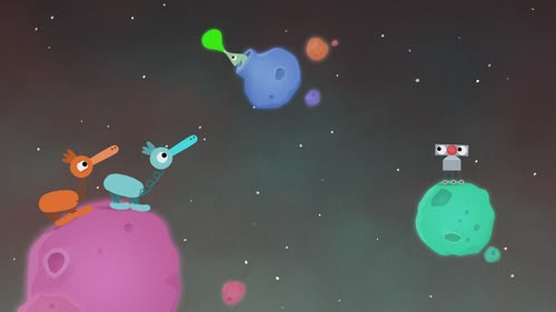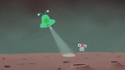 B.O.T. gets caught up in a race between two Spacey Racers as they leap through space.
