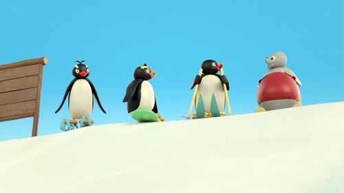 Pingu on skis, his friend on the snowboard, and Robby on the bobsled compete to decide who is fastest. (S1, ep 25)