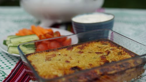 Kugelis is a Lithuanian dish that contains bacon, grated potato, eggs and spring onions.