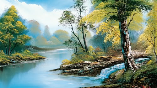 Bob creates an immensely satisfying scene on canvas, featuring fluffy trees surrounding the banks of a rushing river. (S11, ep 13)