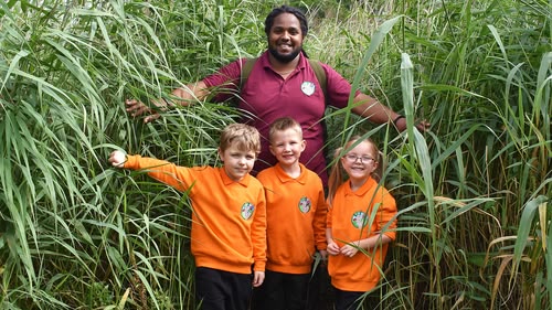Ranger Hamza and the Ramblers walk to a meadow to put vegetable cuttings in the composter.