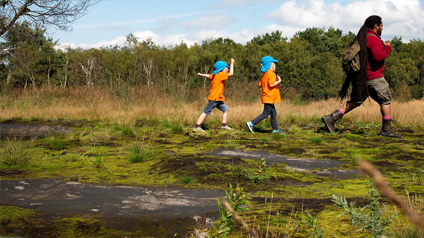 Ranger Hamza and the Ramblers walk through the forest to make bark rubbings.
