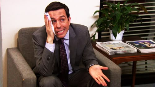 Robert pressures a confused Andy not to give his wife a job in the Scranton office. (S8, ep 9)