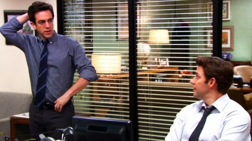 Pam begins to worry that Jim is attracted to her replacement, while Robert asks to jam with Andy, Kevin and Darryl. (S8, ep 7)
