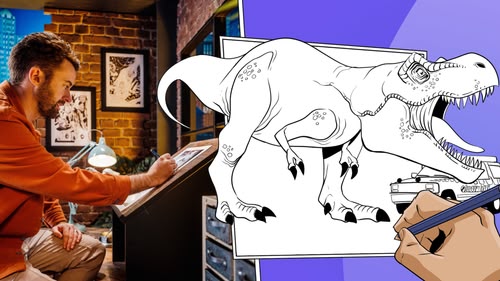 Will draws the ferocious T-Rex from Jurassic Park! Pro tip: add texture for scaly skin and rain. (S2, ep 9)