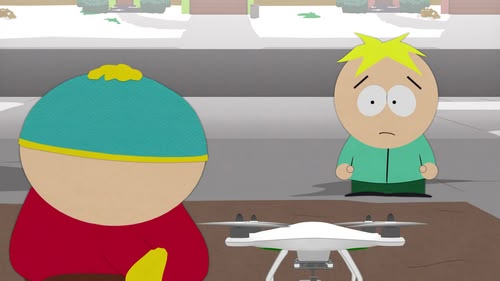 Cartman and Butters spy on Craig's mum using a drone. When the recording they made goes viral on the internet, the people of South Park decide an army of drones is needed! (S18, E05)